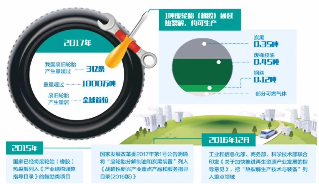 2015年,國(guó)家已經(jīng)將廢輪胎(橡膠)熱裂解列入《產(chǎn)業(yè)結(jié)構(gòu)調(diào)整指導(dǎo)目錄》的鼓勵(lì)類項(xiàng)目。國(guó)家發(fā)展改革委2017年第1號(hào)公告明確將“廢輪胎分解制油和炭黑裝置”列入《戰(zhàn)略性新興產(chǎn)業(yè)重點(diǎn)產(chǎn)品和服務(wù)指導(dǎo)目錄(2016版)》,2016年12月份,工業(yè)和信息化部、商務(wù)部、科學(xué)技術(shù)部聯(lián)合印發(fā)《關(guān)于加快推進(jìn)再生資源產(chǎn)業(yè)發(fā)展的指導(dǎo)意見(jiàn)》,把“熱裂解生產(chǎn)技術(shù)與裝備”列入重點(diǎn)領(lǐng)域。