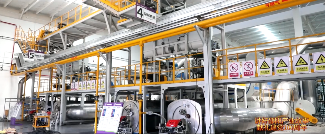 “一輛輛小車(chē)滿載著廢舊輪胎進(jìn)入廠區(qū),卸下的廢舊輪胎隨即被運(yùn)送到上料區(qū),經(jīng)過(guò)智能切割和清洗后再運(yùn)送到智能裂解裝備中”;