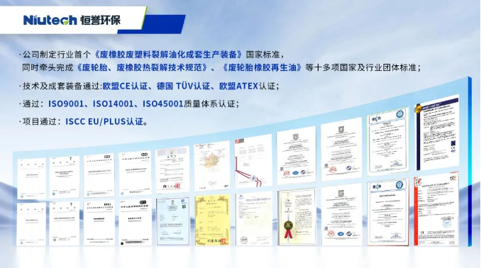 行業(yè)標準制定:2016年公司制定的《廢橡膠廢塑料裂解油化成套生產(chǎn)裝備》國家標準正式頒布,是行業(yè)首個國家標準,同時還牽頭完成《廢輪胎、廢橡膠熱裂解技術(shù)規(guī)范》、《廢輪胎橡膠再生油》、《廢舊輪胎裂解炭黑》等十多項國家及行業(yè)團體標準